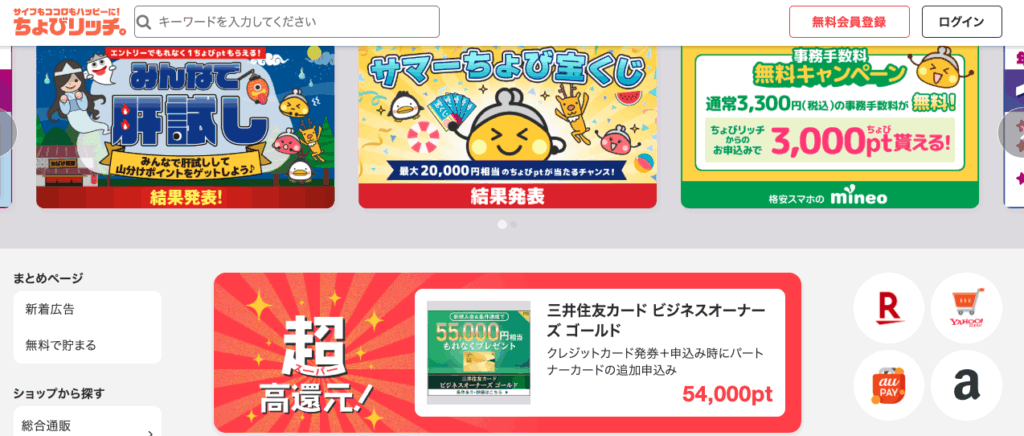| ちょびリッチ | 2倍デーで効率的にポイント増 | Amazonギフト券・PayPay |