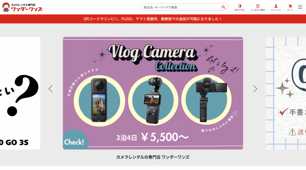 | レンタルカメラ.jp | ネット完結・送料無料・初心者向け | 全国 | 2泊3日4,000円〜 |