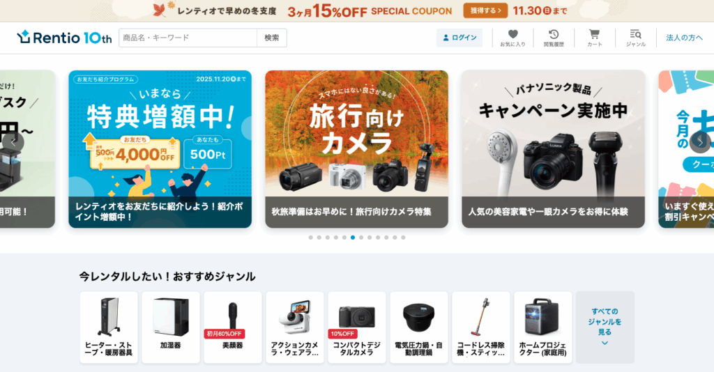 「Rentio(レンティオ)」は、カメラ以外にも家電・ガジェット・ドローンなどを扱う総合レンタルサイト。