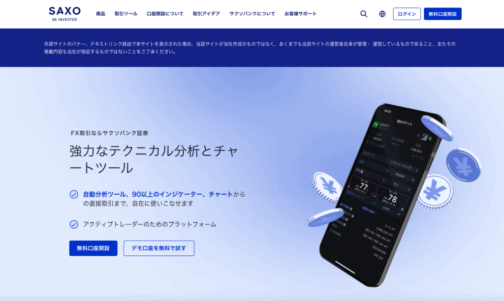 • 特徴:  - 世界中の金融市場にアクセス可能  - 業界最高水準の取扱銘柄数  - スマホアプリ「SaxoTraderGO」で高度な分析が可能