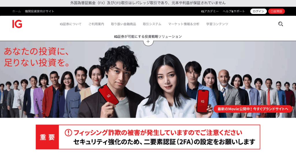 • 特徴:  - CFD銘柄数は国内最多クラス(17,000以上)  - 高機能プラットフォーム「IGプラットフォーム」搭載  - リスクを限定できる「ノックアウトオプション」対応