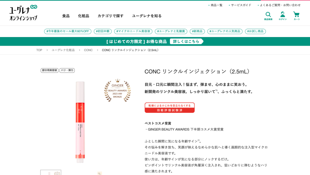 | ユーグレナ リンクルインジェクション | 部分用で軽め | ★★☆☆☆ | 敏感寄り肌 | 目元・口元を集中ケアしたい人 |