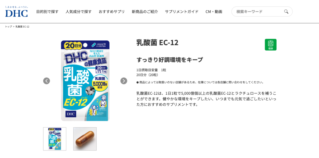 DHCの「乳酸菌EC-12」は、1日1粒で乳酸菌(EC-12)やラクチュロース(オリゴ糖)などを摂れる設計として掲載されています。