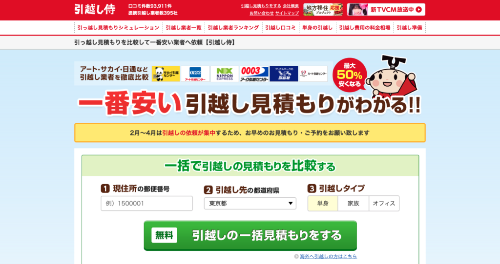 - 引越し侍 — 幅広い条件比較と提携数の多さ