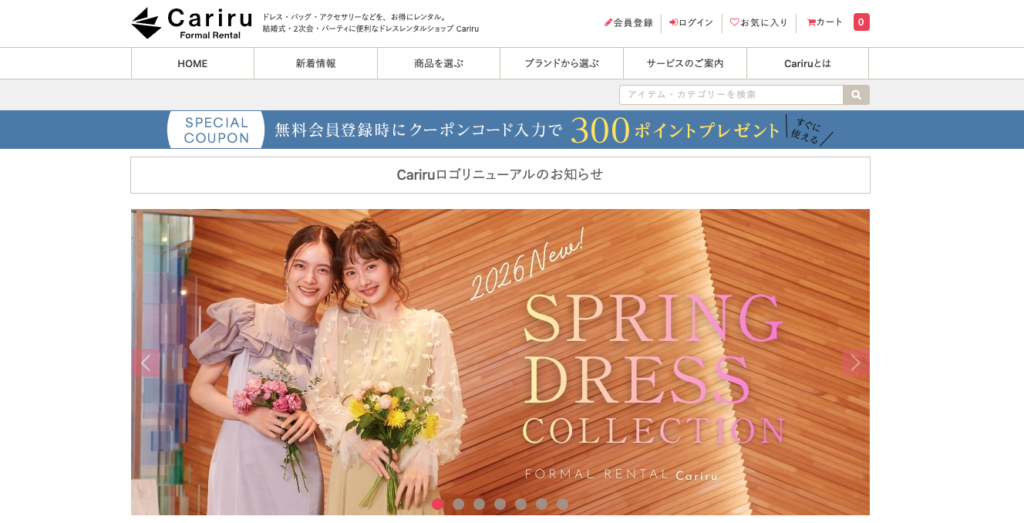 高品質なブランドドレスを、マナー違反の心配なくトータルコーディネートでレンタルしたい方には、Cariruがおすすめです。