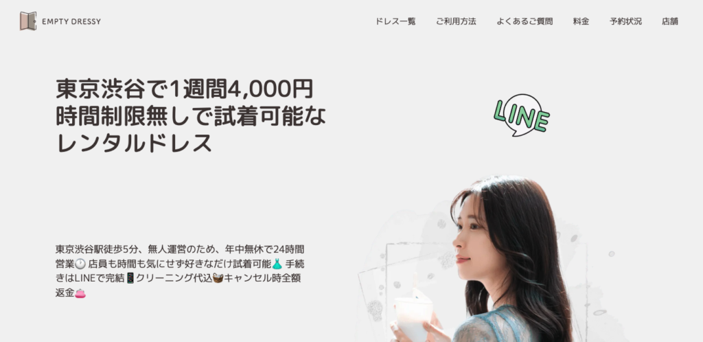 Empty Dressyの最大の特徴は、無人店舗で24時間いつでも試着し放題、さらにドレス単品でもセットでも一律約4,000円という圧倒的な安さです。