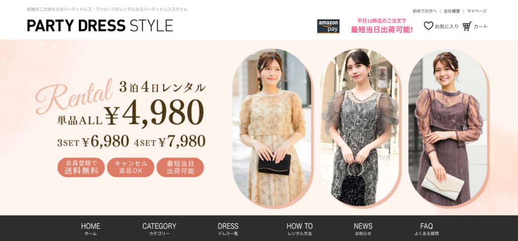 | PARTY DRESS STYLE | 約4,980円〜 | S〜LL | 3泊4日 | 往復1,000円 | 公式サイトへ |