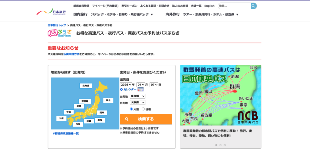 バスぷらざは、大手旅行会社の「日本旅行」が運営する予約サイトで、圧倒的な安心感があります。