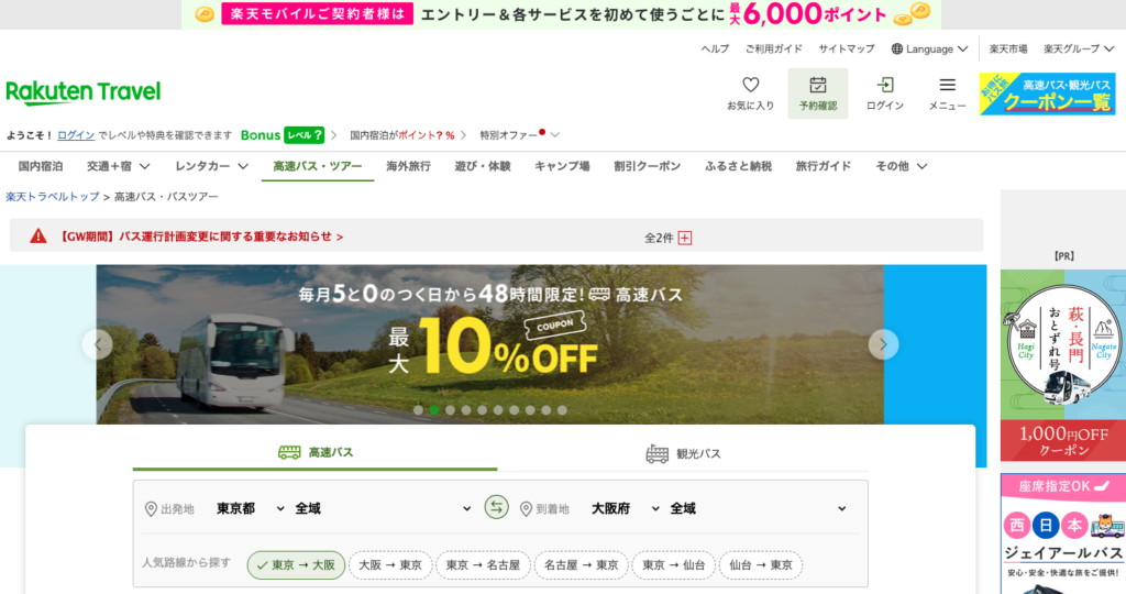 楽天トラベルの高速バス予約は、普段から楽天サービスを利用している方に最適です。