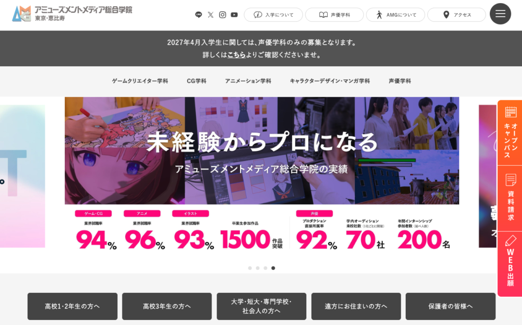 最短でプロへの道を切り開きたいなら、アミューズメントメディア総合学院(AMG)がもっとも適しています。
