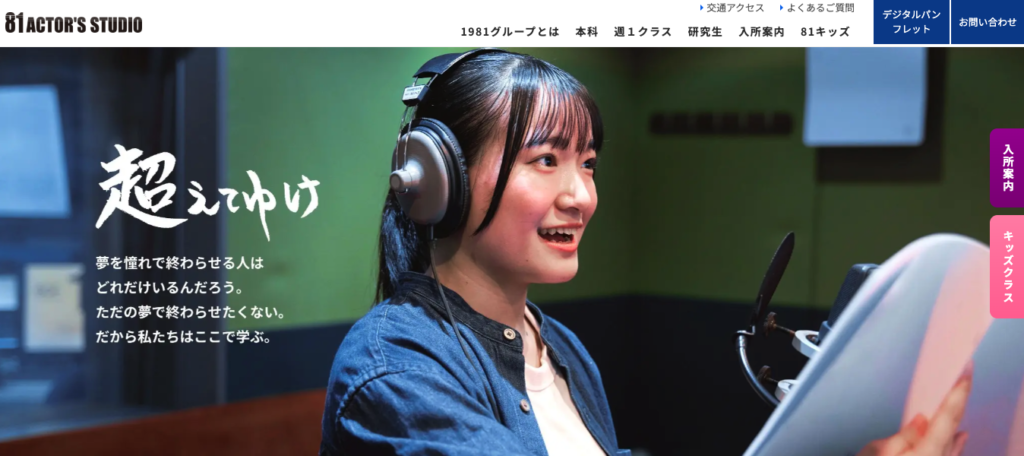 アニメや外画の吹き替え、子供向け番組など、幅広いジャンルで活躍する「81プロデュース」への所属を狙うなら、81アクターズスタジオが確実です。
