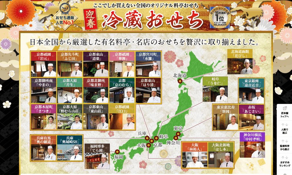 | 2位 | 匠本舗 | 有名料亭監修のおせちが充実。 伝統的な和風おせちを求める人に最適。見た目の美しさも高評価。 |