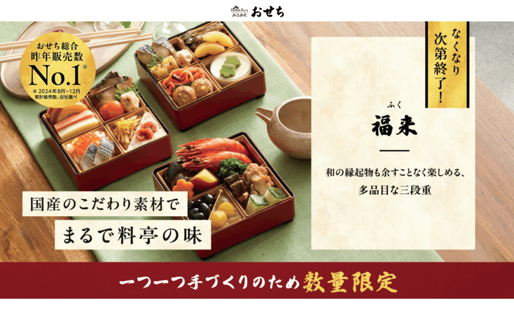 味はもちろん、「素材へのこだわり」「安全性」「口コミ評価」のどれをとっても高水準で、初めておせち通販を利用する人に最も選ばれているブランドです。